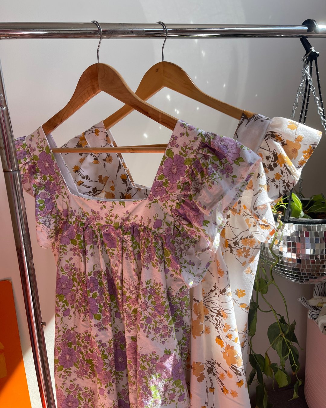 Two fabrics, A) purple floral, B) brown florals